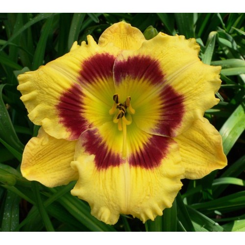 Yellow with blood red band over sculpted yellow to green sunburst throat. Three-way branching with 15 buds and fertile both ways.