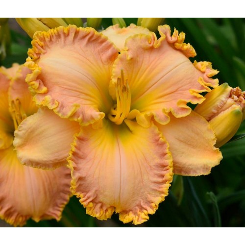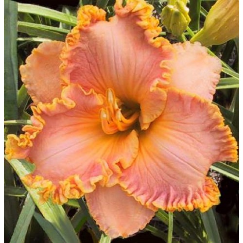 This pink-melon blend has a bright gold throat with green heart and piecrust-ruffled, heavy gold edge that becomes more elaborate with each set of scapes. The petal color is darker near the gold edge, giving the illusion of a double edge. Established plants have always bloomed three sets of scapes during our short bloom season in the mountains of western North Carolina. It has the habit of immediate rebloom from the same fan followed by dependable rebloom shortly thereafter. When grown in a clump, "EDNA" never fails to put on a show! Fragrant with three-way branching, 18 buds and fertile both ways.