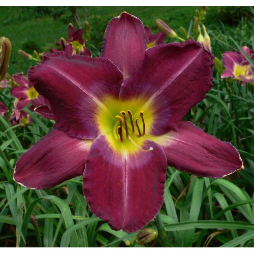 Rich plum purple with lighter watermark and faint midribs over yellow to green throat. Three-way branching with 15 or more buds and fertile both ways.